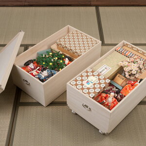 ひな人形や大事な着物などを湿気から守る桐箱です。 商品番号 15-ht27-012 組立状態 完成品(新品) 付属品 キャスター×4(内ストッパー付き×2) サイズ 外寸:(約