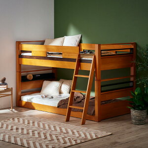 木肌が温かな2段ベッド。上下段に耐震ジョイントを使用した、安心安全構造です。小物が置ける、ちょい棚付きでとっても便利。両枠にしっかりつかめる、ホール付きはしごでしっかり上れる。