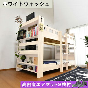 お得セット 高反発 マットレス2枚付き二段ベッド ブックシェルフ 2段ベット コンパクト 子供部屋 大人用 新入学 スノコ 3つ折り シングル マット 折りたたみ マットレス付き