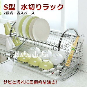 S型2段水切りラック サイズ:52cm/56cm コンパクトなのにたっぷり収納できるステンレス製ラック キッチンをシックに見せるデザイン! 2段式で省スペースにたくさん置ける! お箸やスプーンなどを置けるカトラリーポケット付き...