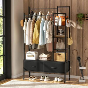 【多彩な収納スタイルに対応】4段シェルフ、2つの引き出し、そしてダブルハンガーの設計で、「掛ける」「置く」「隠す」の3つの収納をこの1台で実現。洋服から小物まで、さまざまな収納ニーズに応える理想のオールインワン収納ラックで
