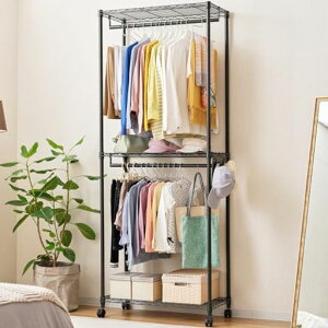 【収納力抜群】ダブルタイプのハンガーラックで、高さの異なるパイプが2本付いています。ロングコートやスラックスなど長さのあるものは上部のパイプに、ジャケットやカーディガンなど短い丈のものは下部のパイプにかけられます。下の