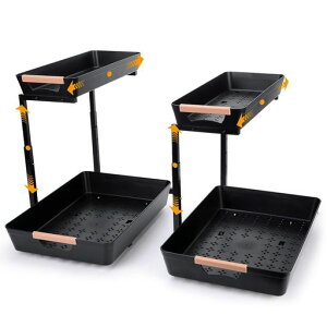下部が広いL字型デザインで、シンク下の収納スペースを有効活用し、キッチンをスッキリ整頓できるL字型構造の2段式シンク下収納ラックです。シンク下のスペースを最大限に活用しま