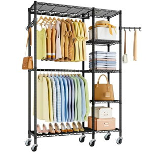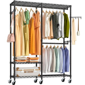 クローゼットスペースの最大化:この衣類ラックのダブルロッドと下部棚を活用して、十分な保管と整理を実現します。多彩なセットアップオプションにより、衣服の整理が簡素化され、クローゼット内により多くのスペースが生まれます。この二重衣類ラック...