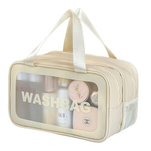 化粧洗面バッグ 2段収納バッグ PVC 収納袋 メイクポーチ メイクバッグ コスメ収納 スキンケア用品収納 仕切り付き 乾湿分離 大容量 防水 水泳 フィットネス 入浴 旅行 出張 多機能 (Whit...