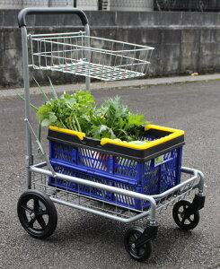 便利なカゴが2段ついた、プッシュ式キャリーカート。 ビッグサイズの後輪と、360°回転する前輪で方向転換もスムーズです。 ●商品スペック ・サイズ 本体 使用時:幅54×奥行き63×高さ88cm 折畳...
