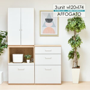 キッチンを彩る選べるシェルフシリーズAFFOGATO(アフォガード) 開き戸と収納2つを組み合わせる2段組みタイプ3点セット。大きさ違いの引き出しが3段ついたチェスト、コンセント付きのオープン引出、可動棚が便利な開き戸の3