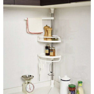 キッチン周りのデットスペースに活用できる、突っ張りキッチンコーナー棚2段収納です。 ●ふきん掛けフックとキッチンツールの収納に便利な吊り下げフック3個が付いています。 ●棚の高さを自由に調整できるので、使いやすいよ...