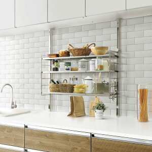 ・サイズ商品画像の説明 一番欲しい場所に、邪魔にならない収納棚をプラス●キッチンのスペースに合わせて幅60cm〜90cmに幅伸縮。2段の棚にすっきり収納できます。●シンクとコンロの間の壁際にも、吊戸