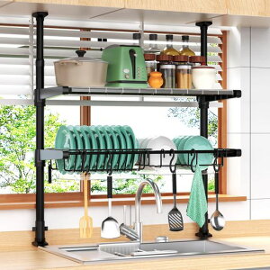 サポートフレーム*2 ?キッチンの限られたスペースを広々使える伸縮式2段水切りラック。 ?洗った食材と箸の一時置き、料理の作業スペース、食器の水切りやふきんの乾燥にと大活躍。 ?4つのフック付きには...