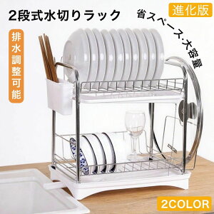?【2段式水切りラック・省スペースと大容量を両立】:2段式デザイン、敷地スベースは小さく縦の空間を生かし、コンパクトでありながら十分な食器置くスベースを確保。狭いキッチンが小さい家庭にピッタリ!ひとり暮らしにも最適...