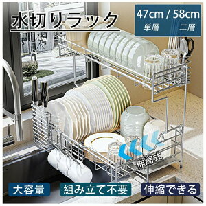 材質:ステンレスサイズ:長さ47cm、58cmタイプ:単層、二層商品特徴:食器はもちろん、フライパンなどの調理用品もしっかり収まる大容量。通気性が良く水が溜まる心配がないので、いつでも清潔に保つことができる。絶妙な傾斜の付いた