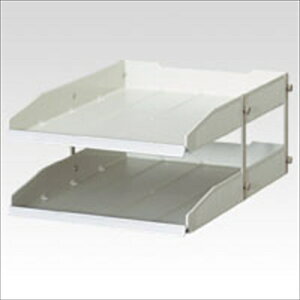 ●規格:2段,A4判タテ型。●外寸:幅250×奥332×高135mm。●トレー内寸:幅226×奥308×高36mm。●材質:本体=再生PS,取手/支柱=アルミ。