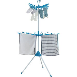 ドライバーなし簡単組立 回転式でラクラク取り入れ 幅広い三脚で安定性抜群! スタンド物干2段 アーム16本 ピンチ10個付 色:ブルー(水色) 商品サイズ:約780×780×1390Hmm
