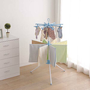 ●室内用のパラソル型物干し。幅35cmまでのタオルが約16枚掛けられます。上段はピンチハンガーなので、靴下などの小物が干せます。ピンチハンガーは取り外して竿に掛けられます。折りたためば隙間にすっきり収納ができます。・使用時サ