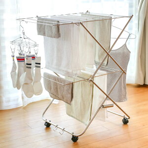 物干し竿に掛けるだけの簡単設置。2段で衣類を掛けることができるので省スペースでたくさん干すことができます。本体が伸縮するので、スペースに合わせてお好みの長さに調節可能。収納時は折り畳んで、物干し竿等に引っ掛けたまま...