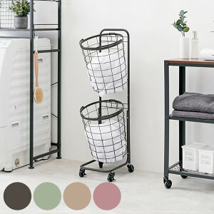 ■2段ランドリーラック キャスター付 縦型 丸型 丸カゴ バスケット カゴ おしゃれ ホワイト グリーン ブラウン ベージュ グレー ピンク 角型 四角カゴ 角カゴ■...