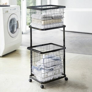 シンプルでスタイリッシュなランドリーワゴン。ランドリーワイヤーバスケットが2台置けるランドリーワゴンです。 コーナーが開いたデザインになっているので、縦置き・横置きでもランドリーバスケットが取り出しやすくなっています。