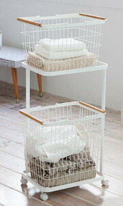 商品情報【商品説明】タテに配置された2つのバスケットで洗濯物を分類できる。ワゴンはコーナーが開いているのでバスケットが取り出しやすく、衣類が入れやすいのも魅力。ストッパー付きキャスターで移動や固定もラクラク。シンプルか
