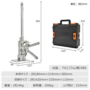 ◆木工クランプ・ジャック昇降の1台2役 ◆精密目盛り ◆耐荷重200kg ◆2段階下降速度調整 ◆頑丈な金属製ボディ ◆差し込みやすい斜め加工 ◆豊富な付属品 ◆収納ケース付き ◆設置・修理・清掃など様々な場面で大活躍 【商品内容】:ハン