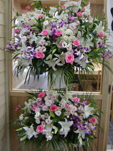 *商品サイズ 奥行:約50cm×幅:約90cm×高さ:約170cm (※2段で作成) *花材 メイン ユリ、グリーン、枝ものなど その他 *資材・ラッピング 名札(縦、横書き)を無料でお付けいたします...