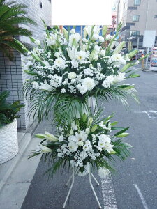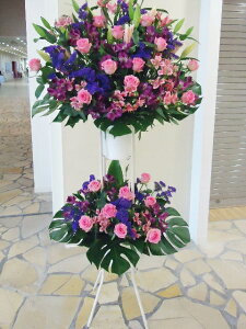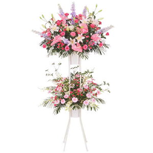 *商品サイズ 奥行:約50cm×幅:約90cm×高さ:約170cm (※2段で作成) *花材 メイン ユリ、グリーン、枝ものなど その他 *資材・ラッピング 名札(縦、横書き)を無料でお付けいたします...