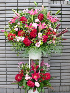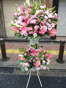 ご開店お祝いや舞台やコンサートのご出演お祝いにロビー花としてご利用いただけます!! 写真は、白色のスタンドを使用しています。 スタンドの脚の長さは120cmです。 写真のスタンド花は、ダリア、百合、アルストロメリア、トルコギキ