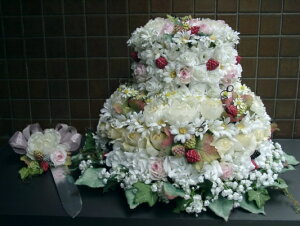 お客様のご希望にあわせて制作したブライダルアートフラワーケーキ2段型。 白い花を多めに淡いピンクやクリーム色でまとめました。 すそにはカスミソウを使い柔らかさを出しました。 ポイントにはラズベリーを、マーガレット...