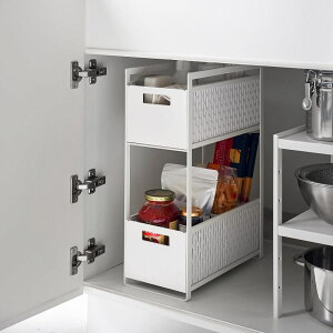 ●扉タイプのシンク下空間を有効活用! ●スライド式のバスケット2段タイプ。 ●スパイス・缶詰・レトルト食品・掃除道具などのストックに。 ●背の高い調味料・洗剤・ペットボトルなどの収納に便利。 ●洗面台下のラックとしてドライ