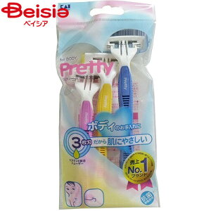 「女性用カミソリ プリティー ボディT 3枚刃 3本入」は、3枚刃とビタミンE配合のスムーザーで肌にやさしいボディ用カミソリです。滑りにくいソフトハンドルで持ちやすいオーバーサイズ。肌にフィットする角度でスムーズな剃り心地です...
