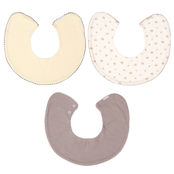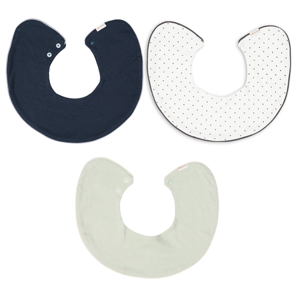 3枚組のおしゃれなスタイをご提案致します。 素材は綿100%の40/-スムースを使用しています。 布帛のパイピングが付いた色無地、共生地のパイピングが付いた色無地と総柄、合わせて3枚入りになります。 汚れたら回転させて使用できるため、...