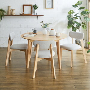 商品詳細 丸テーブル5点セット 直径120cm丸テーブル+オシャレなデザインのチェア4脚の計5点セット テーブルには木目の美しいアッシュ無垢材を使用 チェアの木部にもアッシュ無垢材を使用 チェア座面は年中快適なファブリック素材 カラー2色