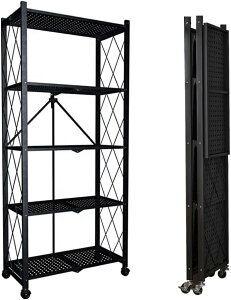 4段 折りたたみスチールラック【広げるだけで使える】幅71×奥行34×高さ127cm 収納ラック 棚ラック スチールシェルフ キャスター付きメタルラック 折り畳み式 オープンラック キッチンラック シェルフ...