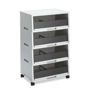 ●段…4段●外寸サイズ…562×383×914mm●重量…12.3kg●材質…本体・引出:ポリプロピレン(再生樹脂)、中仕切・前面パネル:ABS樹脂、パイプ:鉄(PE被覆)、キャスター:ナイロン●キャスター直径…40mm●キャスター…...