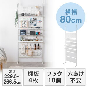 リビングやダイニング、玄関やキッチンなど、お部屋のいろいろな場所に設置できる突っ張り式ラック。スチール製の有孔ボードのためフックやマグネットに対応。壁に穴を開ける必要が無いので、マンションやアパートなどの賃貸でも設置