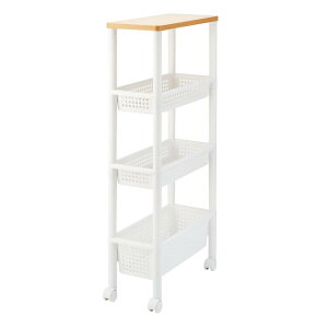 すきまにピッタリ。幅27cmのワイドタイプ4段のワゴンです。●スタイリッシュなホワイトカラーで、キッチンや洗面所などあらゆるシーンでのストック収納におすすめで