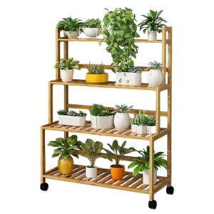 フラワースタンド 室内 屋外 ガーデンラック 4段 キャスター付き 移動ラクラク 風通しいい 安定感 ガーデニング 棚 竹製 簡単組立 鉢植え 観葉植物 棚 花台 屋外 (4段-幅80cm(キャスター付き)) 【ガーデンラック...