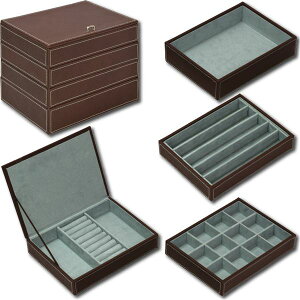 商品情報 特徴 【4層収納】 このジュエリーボックスには、小さなジュエリーは上部の3つの層のさまざまなスロットに収納され、サングラスや腕時計は大きな下の引き出しに収納されます。引き出しタイプで、ネックレス、ピアス、指輪など