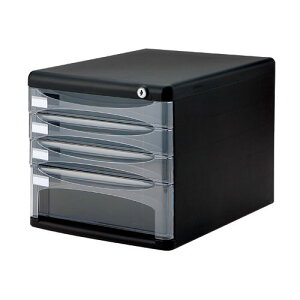 ●タイプ:鍵付きタイプ ●引出し:浅型3段・深型1段 ●規格:A4 タテ型 ●色:ブラック ●外形寸法:幅271×奥362×高260mm ●引出し内寸:浅型=幅241×奥316×高36mm、深型=幅239×奥316×高79mm
