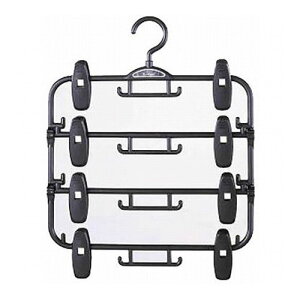 本のハンガーでスカート4本を効率良く収納。◆ロングクリップがスカートをしっかりキャッチ。◆2段でも4段でも調節可能。◆2つのフックをバーに掛けると衣服が取り出しやすく、1