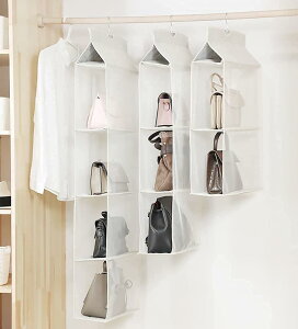 すっきり収納!吊り下げ式カバン収納ラックです。型崩れを防ぎ、バッグの形をしっかりキープします。ハンガーフック付、クローゼットのすき間を有効活用。両サイドメッシュ仕様◎通気性が良く、見やすいのでバッグ選びもラクラク。縦