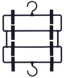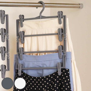 1本のハンガーでスカート4本を効率良く収納。 ●ロングクリップがスカートをしっかりキャッチ ●2段でも4段でも調節可能。 ●2つのフックをバーに掛けると衣服が取り出しやすく、1つだけ掛