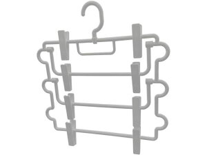 プラスチック製スカート用ハンガー ★スカート4枚を1枚分のスペースで、 効率よく収納できます。 ★バーを取り外す事ができます。 ★挟み跡がつき難いゴム質の滑り止めを採用。 商品サイズ:330×400mm、厚さ:32mm 商品のカラーは...