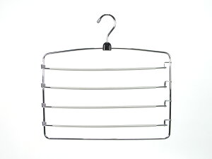 スラックスやスカートをしっかりとホールドする便利なアイテムです。 丈夫なスチール製で、長持ちするのが嬉しいポイント。 バーは片側が外れてスイングするので、簡単に掛けられます。 最下段のバーも活用できるので、収納力も抜群。