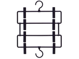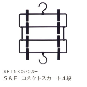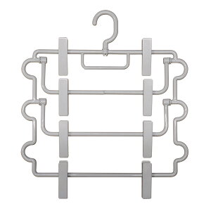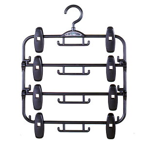 1本のハンガーでスカート4本を効率良く収納。 ●ロングクリップがスカートをしっかりキャッチ ●2段でも4段でも調節可能。 ●2つのフックをバーに掛けると衣服が取り出しやすく、1つだけ掛