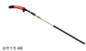 速く枝打ちが出来るようにと、25年ほど前に出来た製品が高枝鋸「はやうち」です。軽量・アルミ楕円ポールを採用し、たわみが少ないポールに仕上げました。生木の剪定・枝打に適しており、林業の枝打やゴルフ場の剪定にご使用になれます。