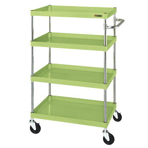 特徴 ●ボルトレスで組立簡単。 ●棚板を逆さにするだけで、皿型・フラット型と組み替えることができます。 ●ゴム車を使用しているツールワゴンですので、表面硬度が低く、弾性を持っている為、凹凸のある路面でも容易に走行し安定性