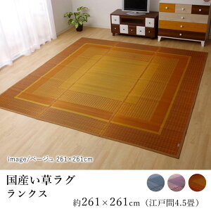 国産い草ラグカーペット ランクス サイズ 約261×261cm(江戸間4.5畳) 組成 表地:い草(九州産) ※紋織 ヘリ:綿100% カラー ベージュ・ワイン・ネイビー 機能 抗菌・防臭・防湿。