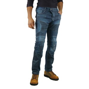 シルエットの際立つスーパースリムフィットパターンのストレッチデニムジーンズ。両膝には高強度生地ケブラーを補強として使用。標準装備のCE規格レベル2プロテクターは外入れ式なので着脱しやすい。また、別売りハードプロテクターに
