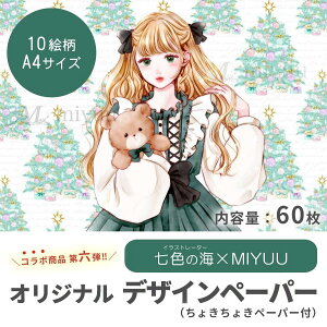 ご好評頂いているオリジナルアイテム♪miyuuと人気イラストレーター七色の海様コラボオリジナルデザインペーパー10枚のかわいいイラストに合うようおしゃれな背景イラストをプラスし、カットしてコラージュにお使い頂ける、ちょきちょき
